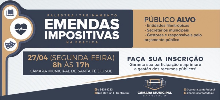A Câmara Municipal de Santa Fé do Sul realizará, no próximo dia 27 de abril, das 8h às 17h, uma capacitação com o objetivo de orientar sobre o recebimento de emendas impositivas municipais e esclarecer as recentes exigências estabelecidas pelo Tribunal de Contas do Estado (TCE).